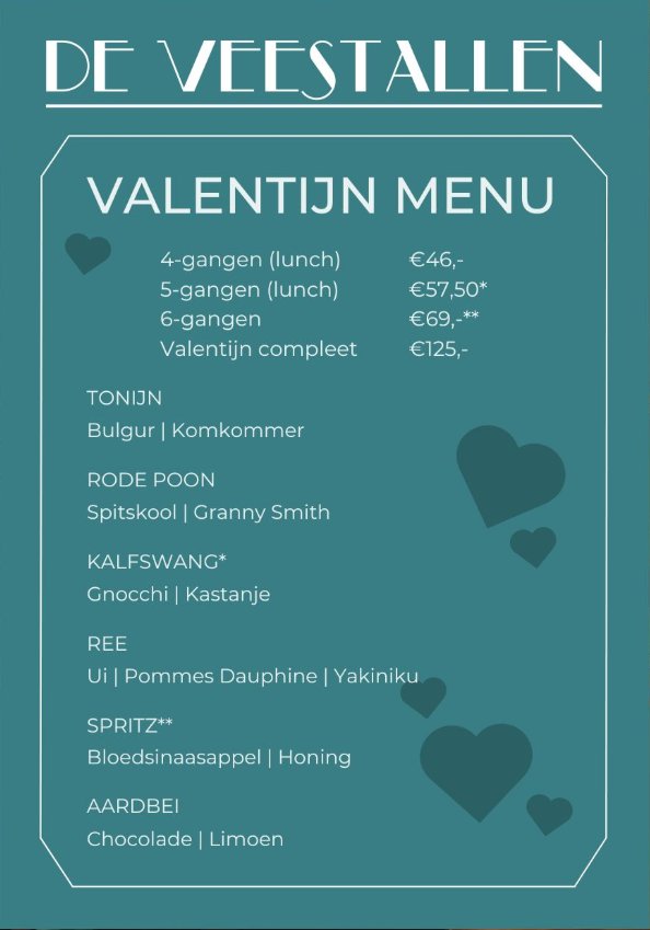 Vier de liefde met een culinair Valentijnsmenu bij Restaurant De Veestallen. Op 13 & 14 februari verwennen we je met een speciaal samengesteld menu, perfect om samen van te genieten. Of je nu langskomt voor de lunch of het diner: romantiek staat centraal