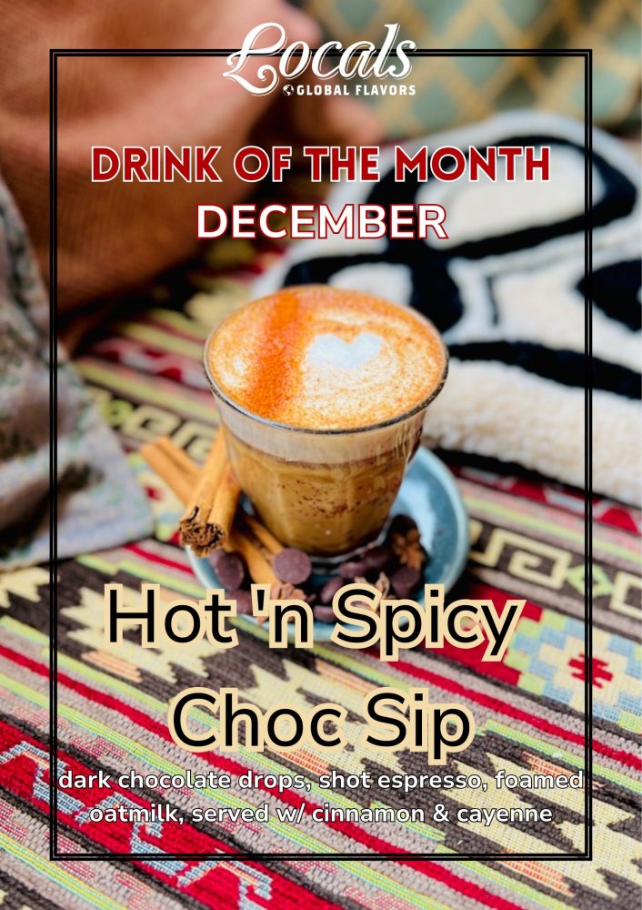 Onze laatste drankje van de maand, de Hot 'n Spicy Choc sip. Een espresso met druppels van donkere chocolade, opgeschudde havermelk met kaneel en cayenne peper. Lekker warm en kruidig drankje tijdens het shoppen!
