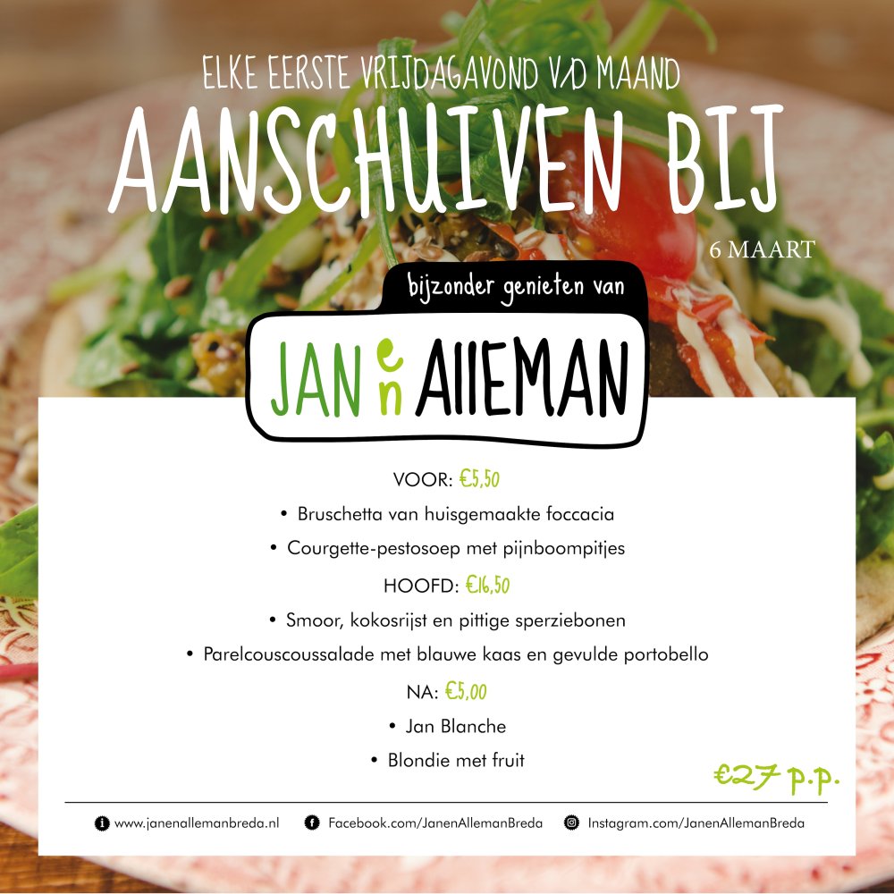 Je kunt bij ons elke eerste vrijdagavond van de maand aanschuiven vanaf 17:00 (de keuken sluit om 20:00). Het hele menu kost €29,- maar het is ook mogelijk de gangen los te bestellen. Reserveren kan via de telefoon 076- 7634055 of mail naar info@janenallemanbreda.nl.