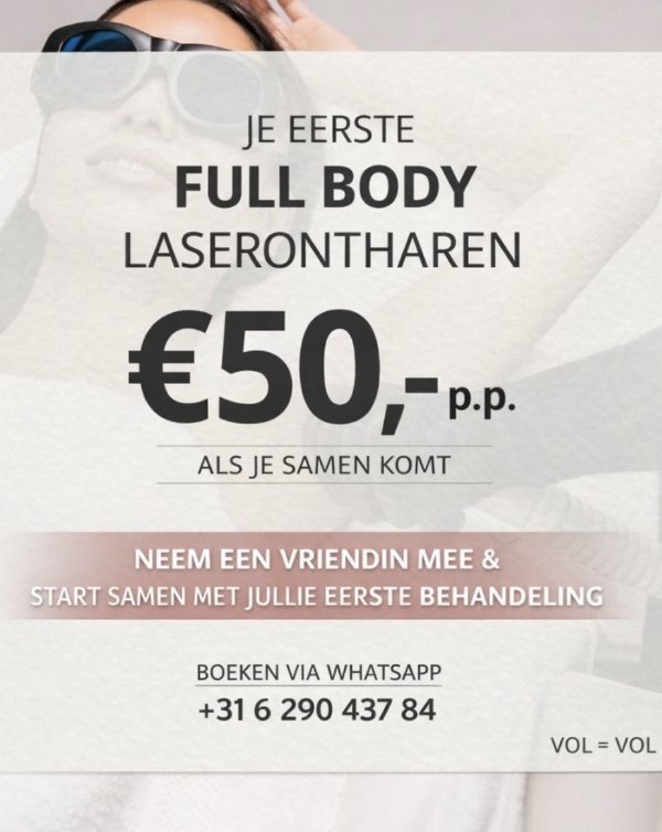 Je eerste full body laserontharing – €50 ✨ Neem een vriendin mee en beleef samen jullie eerste behandeling! Profiteer van deze speciale deal en start samen met een gladde, verzorgde huid. Perfect om het samen te ervaren én te besparen! Read more