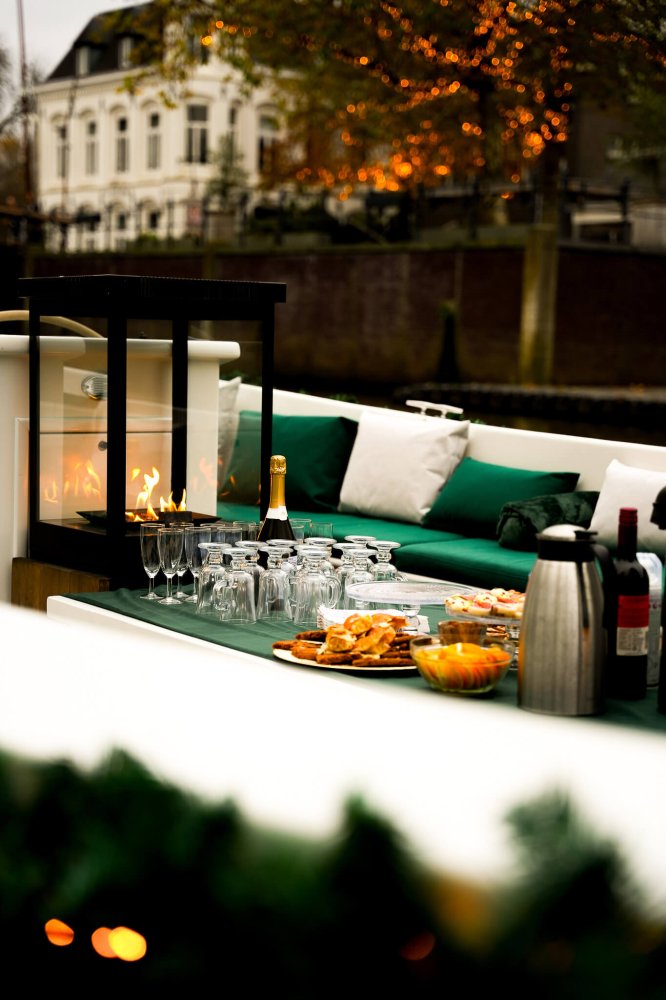 Geniet van een gezellige winterse vaartocht op de Glühweinboot in Breda. Deze 100% elektrische fluisterboot heeft 2 luxe buiten haarden aan boord en biedt een unieke manier om de sfeervol verlichte singels van Breda te verkennen. Terwijl je onder dekentjes lekker warm bij de haard zit, geniet je van glühwein, warme chocolademelk met rum, bier, wijn, fris en water. Alle drankjes worden warm of op perfecte temperatuur geserveerd, zodat je volop kunt genieten van een knusse winterervaring op het water.