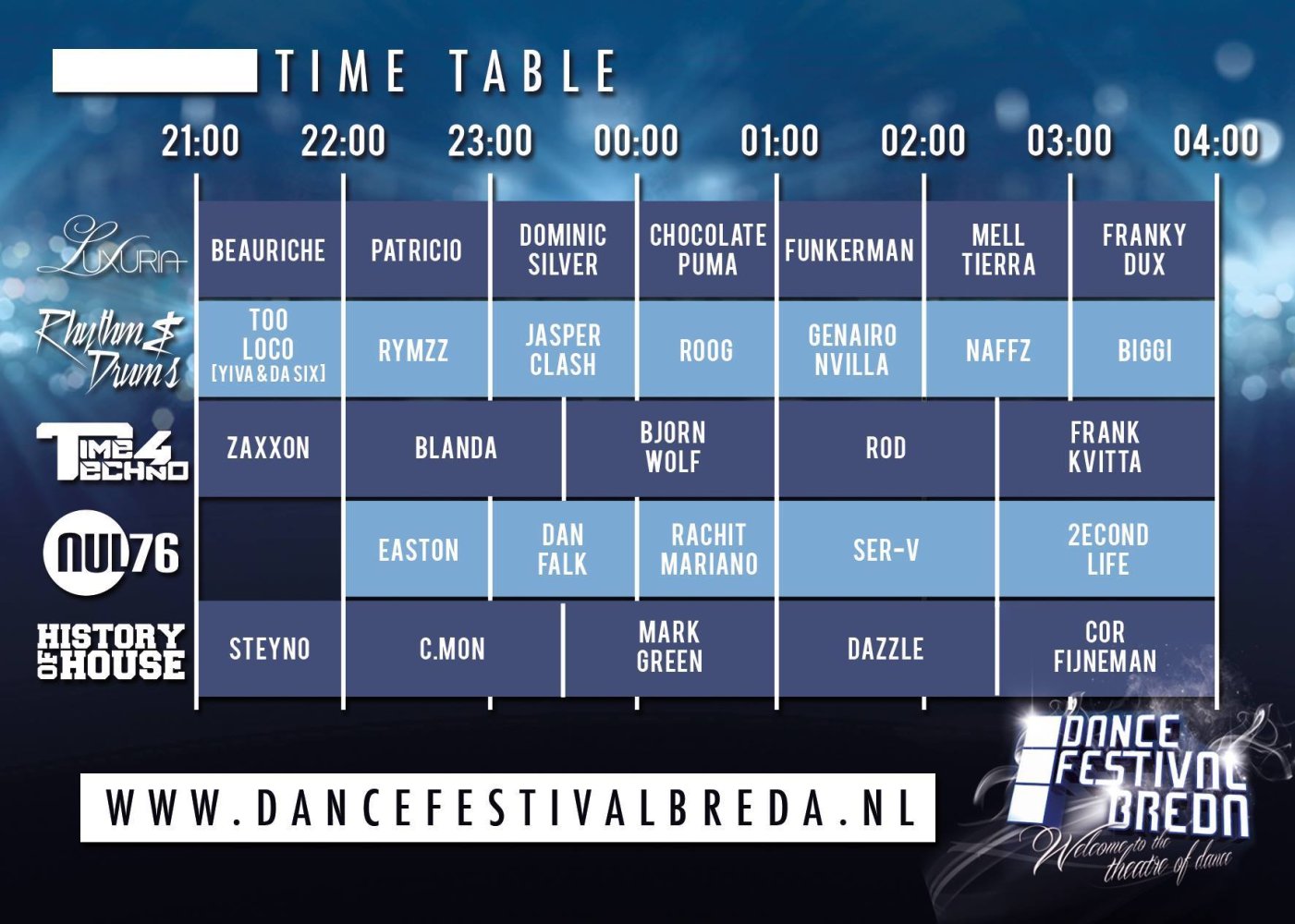 Op het festival draaien 29 verschillende DJ's, waarvan een groot gedeelte uit Breda. Vorig jaar kwamen er ook een aantal DJ's onaangekondigd langs, zo verscheen Hardwell ineens aan de draaitafels. Bekijk onderstaand de volledige time table. Het programma op je mobiel? Download dan gratis de Breda City App!