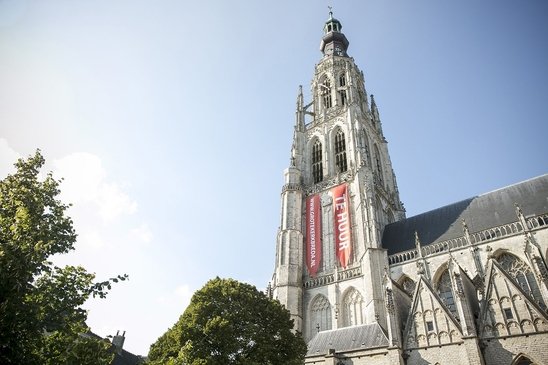 De Grote Kerk van Breda is te huur. Dat wordt sinds vrijdag nadrukkelijk kenbaar gemaakt tegen de toren van de Grote Kerk in Breda met twee enorme spandoeken die dit onderstrepen.