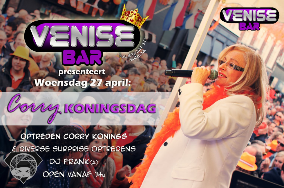 Na het grote succes van vorig jaar treedt de Koningin van het Levenslied weer op bij de Venise Bar tijdens Corry KONINGSDAG. Diverse Surprise Acts zullen ook hun opwachting maken op het podium, de muziek wordt verzorgd door DJ Frank(a).