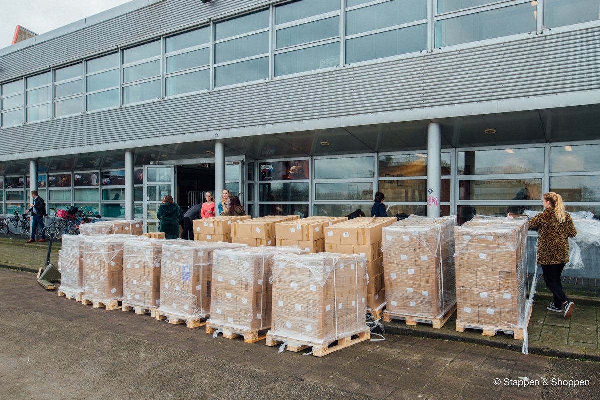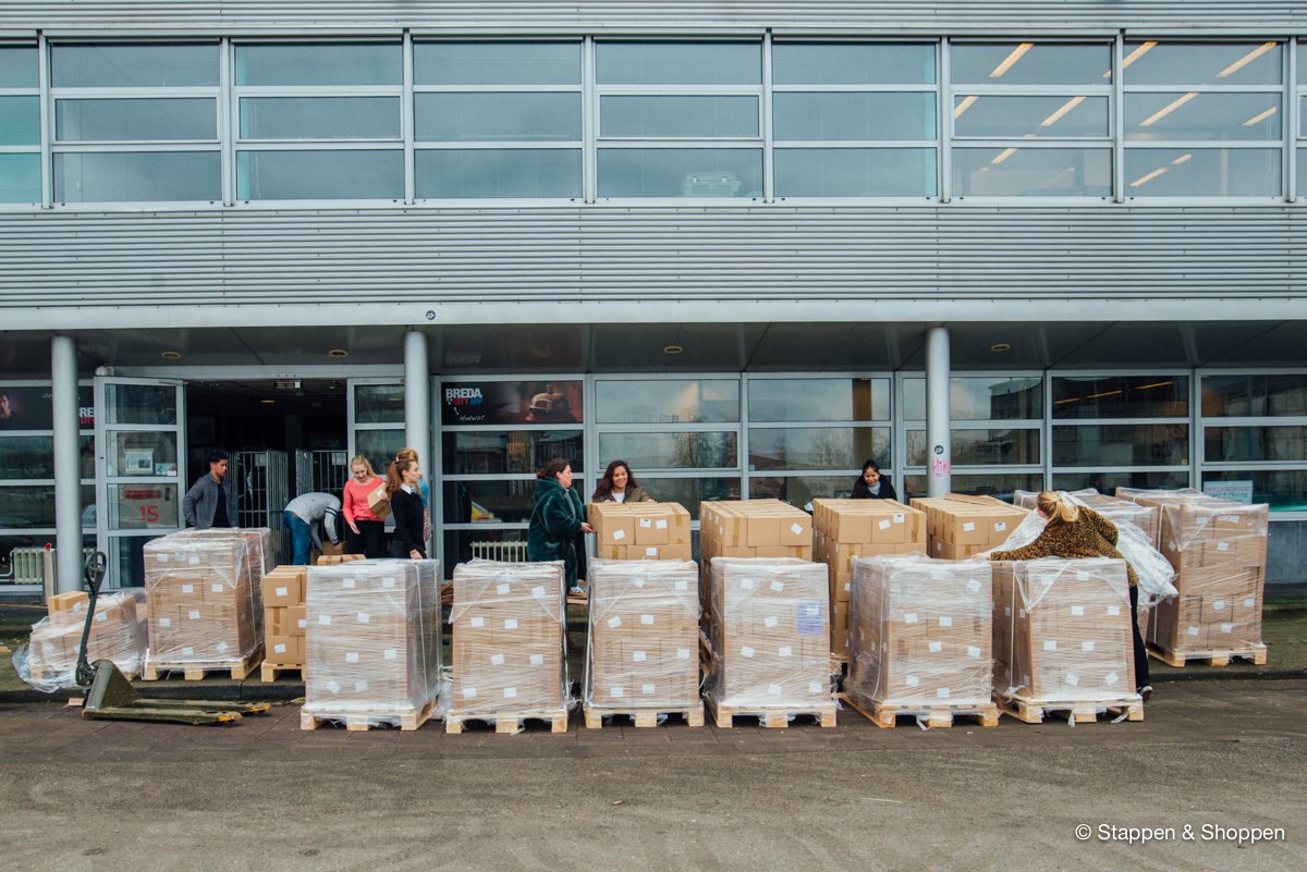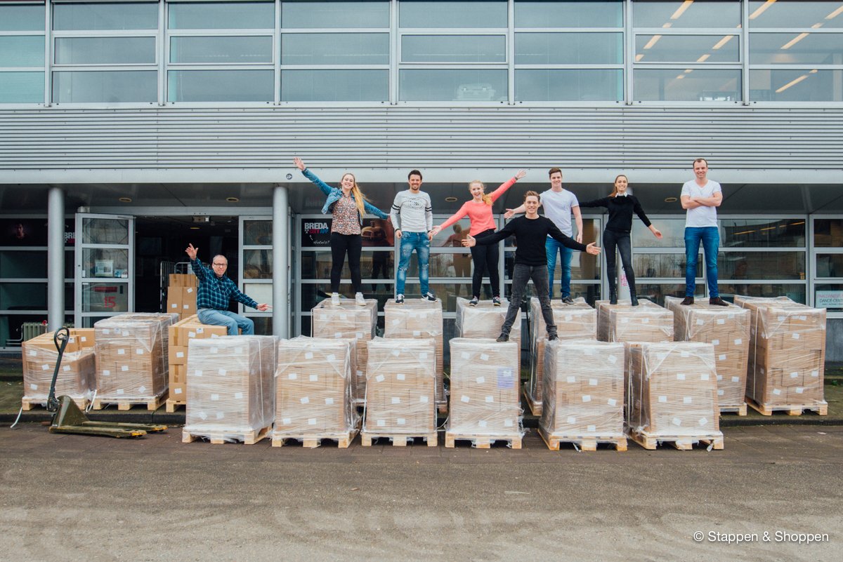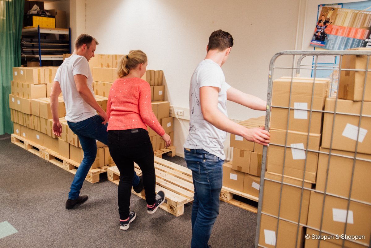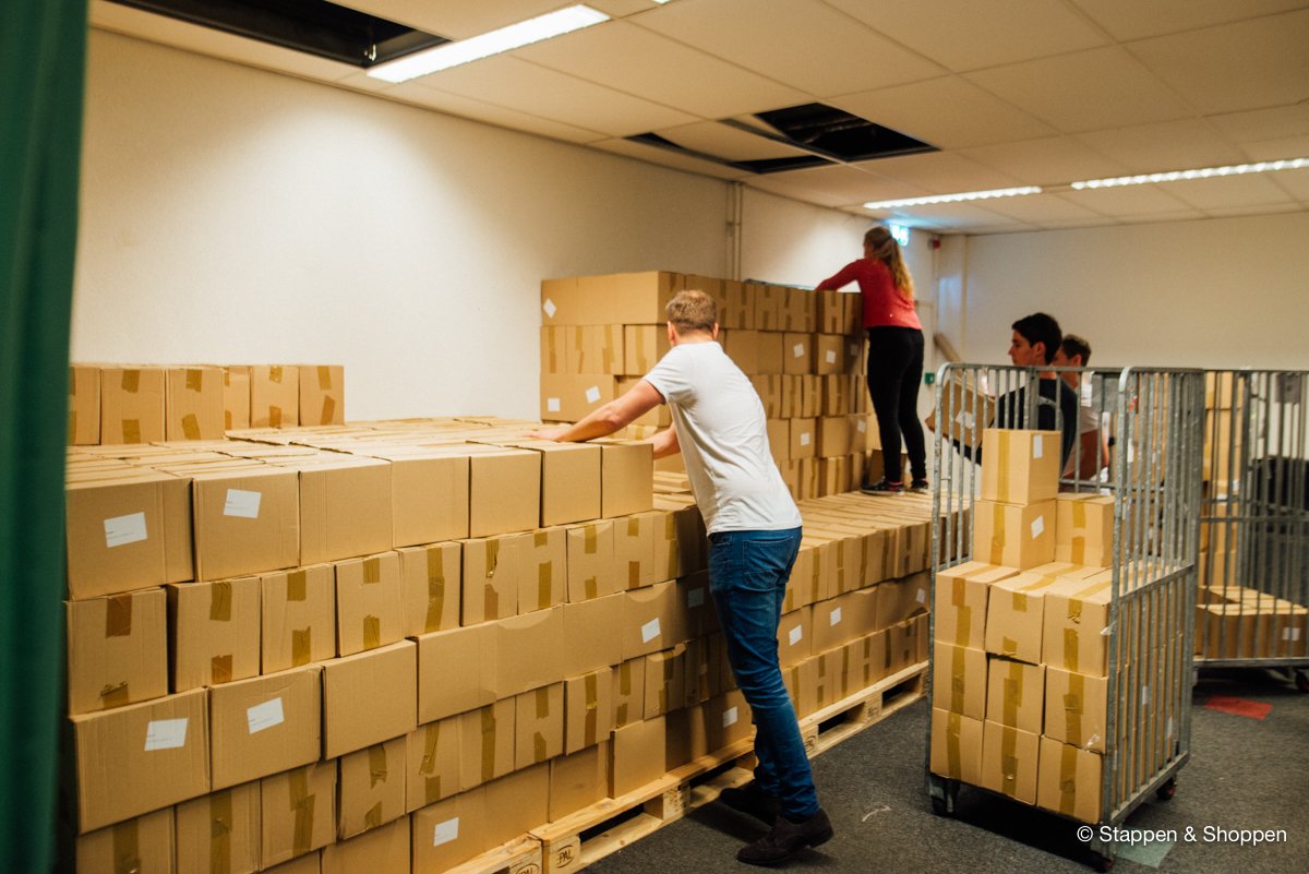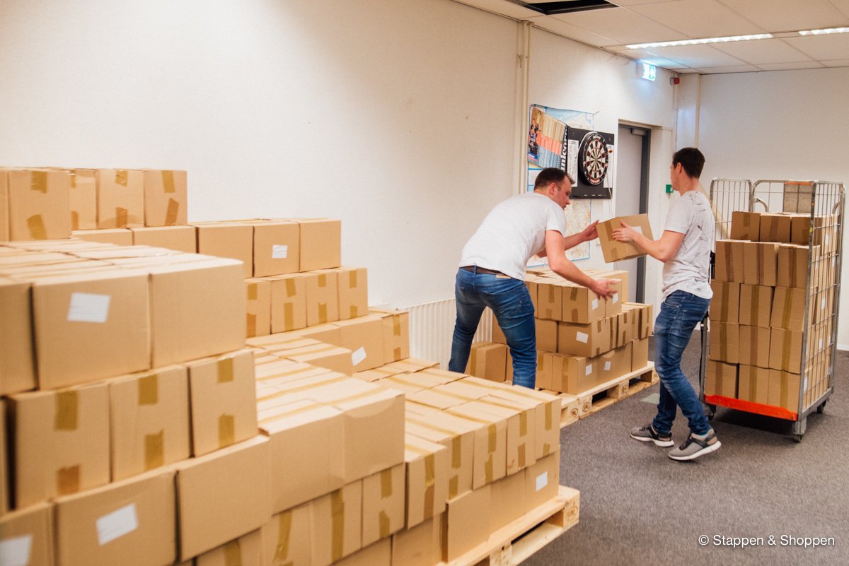 De magazines worden op 18 pallets geleverd en wegen in totaal 15.000 kilo. Elk doosje moeten we met de hand overladen en naar onze opslag achterin het pand brengen. Gelukkig maken vele handen licht werk ;)